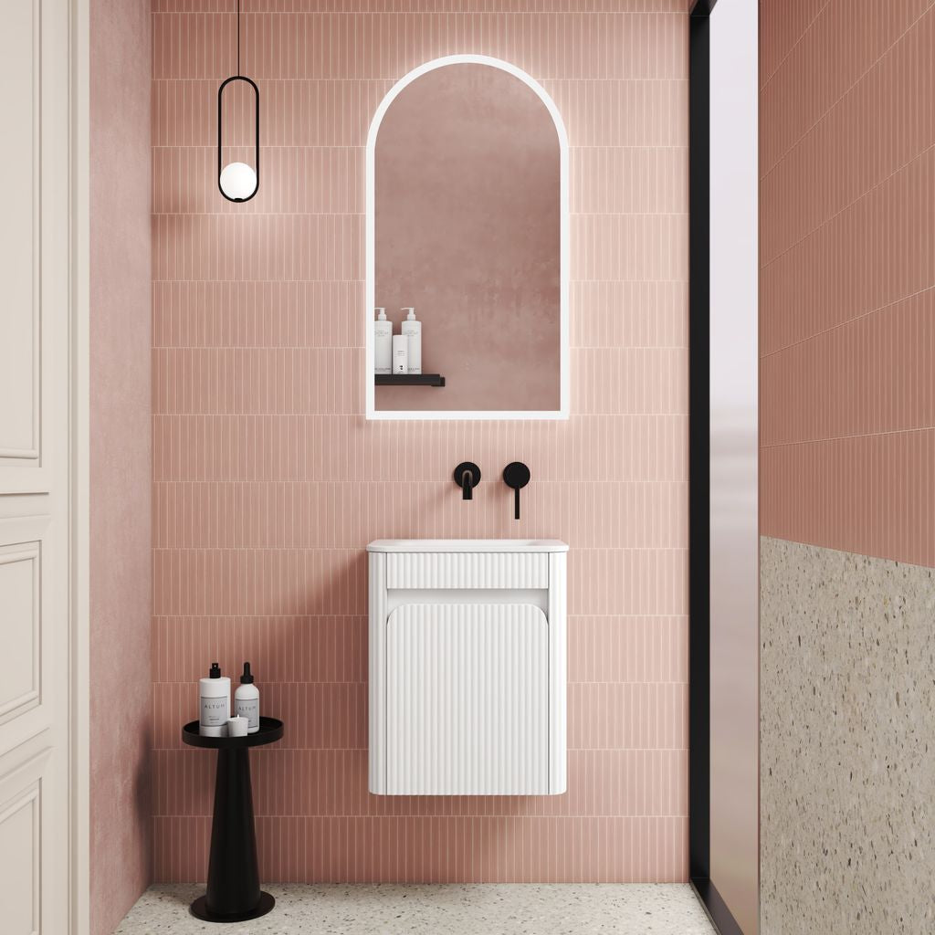 This wall hung Mini Vanity combines smart design with modern sophistication. Featuring elegant curved ends and crafted from premium-grade, durable timber plywood, it’s built to last. The contemporary V-groove polyurethane finish in matte white brings warmth and texture, while minimalist finger-pull doors maintain a sleek, uncluttered look. Inside, a premium graphite interior adds a refined contrast, offering both functionality and flair in a versatile, space-saving form.