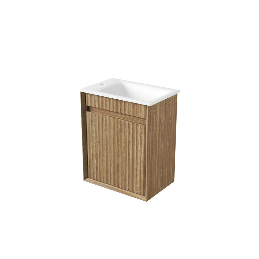 This mini wall-hung vanity is designed to elevate compact spaces with smart functionality and standout design. Crafted from premium-grade, durable timber plywood, it features a sleek bevel edge profile and a contemporary wave groove in thermo laminate harvest oak colour finish. The minimalist finger pull drawers maintain a clean, modern aesthetic, while the premium graphite interior adds a sophisticated touch. Wall-mounted for a floating effect, this vanity offers both versatility and spacious storage without sacrificing style.