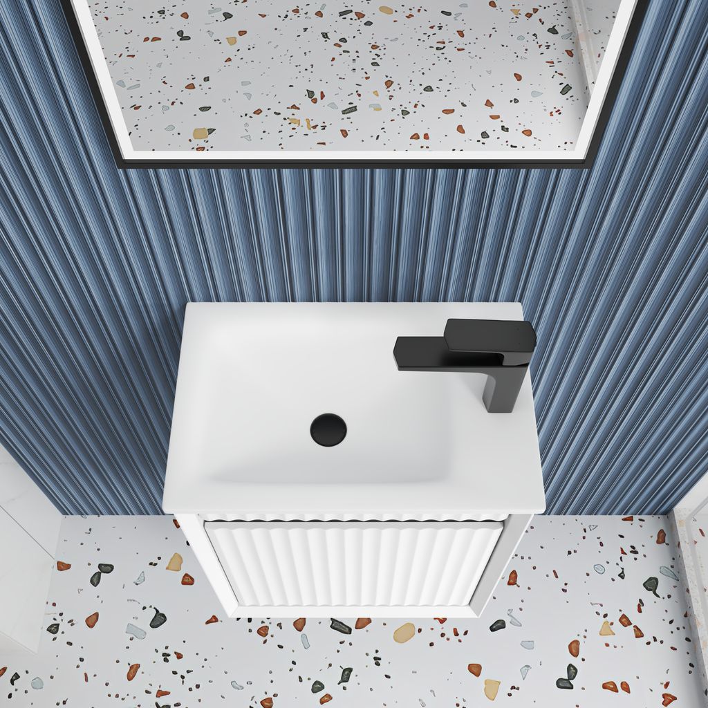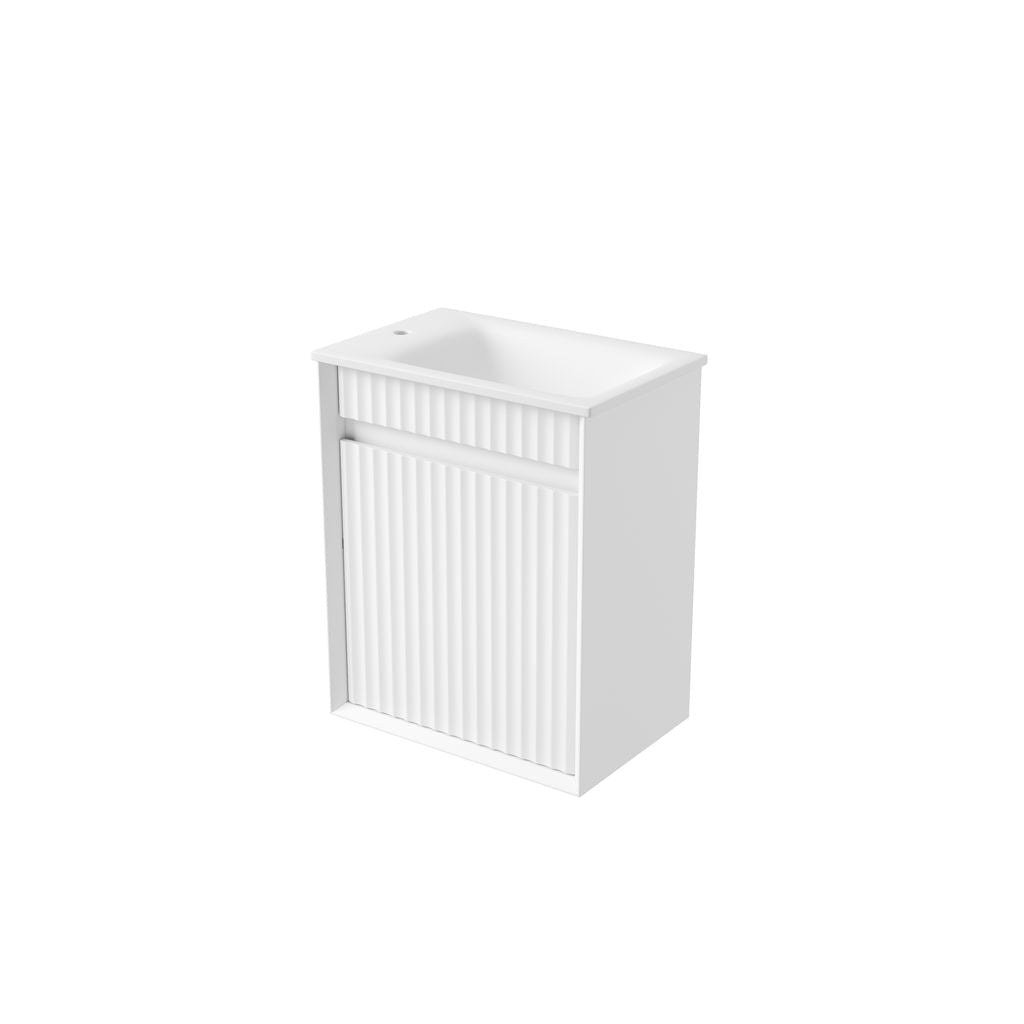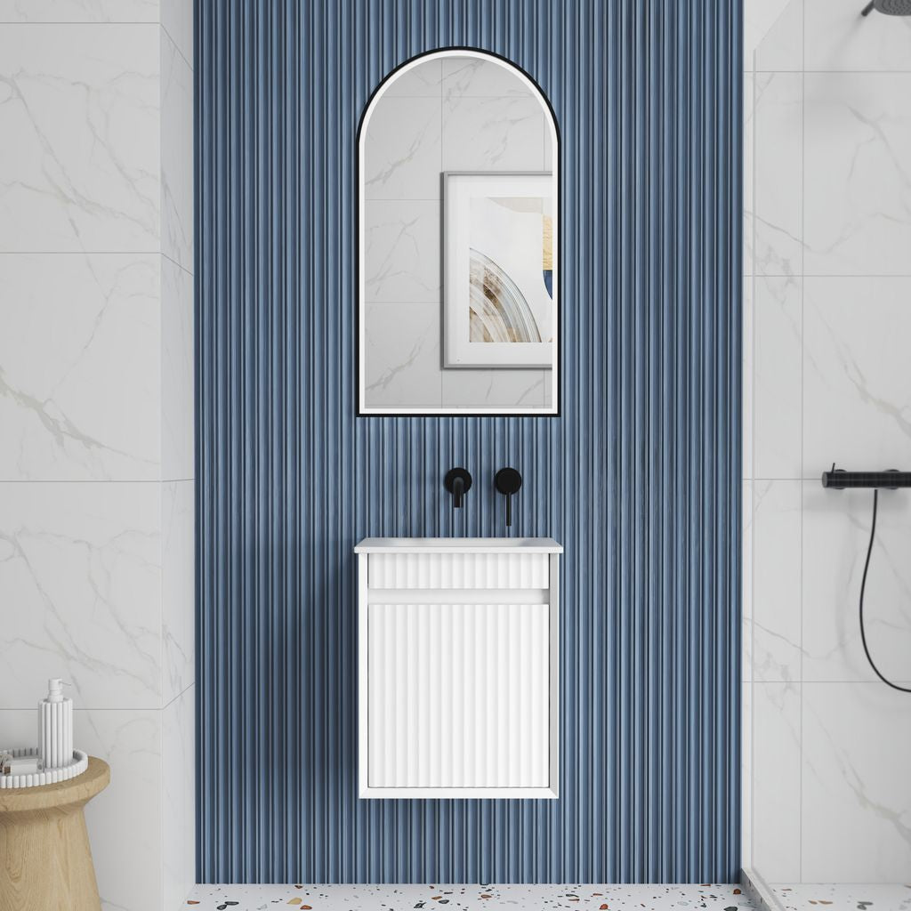 This mini wall-hung vanity combines sleek design with smart storage solutions. Crafted from premium-grade, durable timber plywood, it features a clean bevel edge design and a contemporary wave groove polyurethane finish in crisp matte white. The minimalist finger pull drawers enhance its streamlined, floating look, while the premium graphite interior adds a refined contrast. Perfectly sized for compact spaces, this versatile vanity offers spacious storage without compromising style.